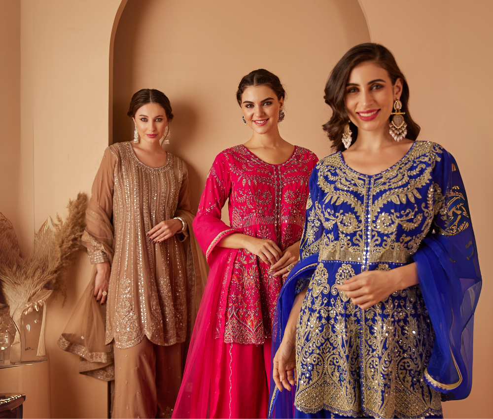 Show product Magenta Embroidered Peplum Suit Set With Flared Pants & Dupatta - Set Of 3