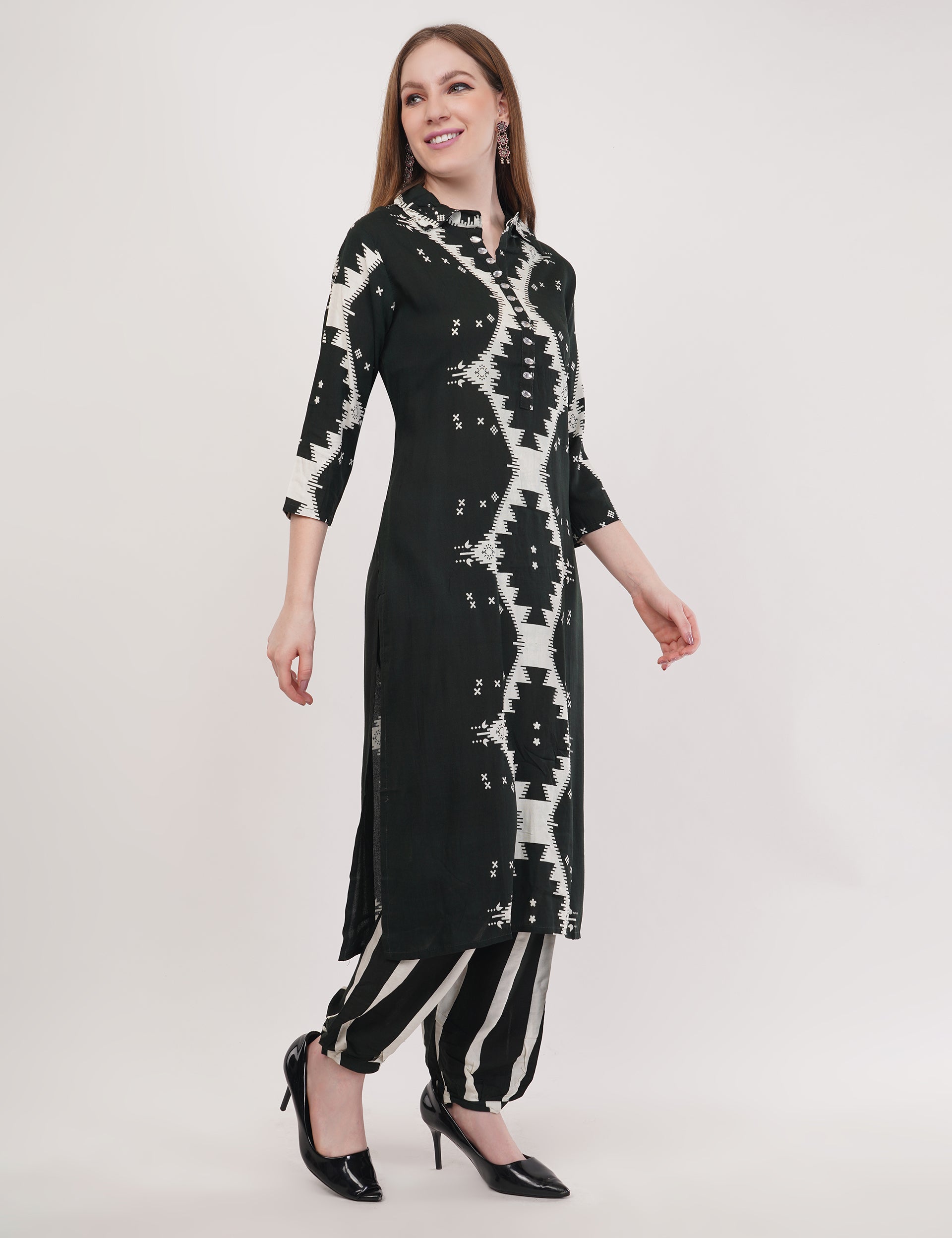 The Black Abstract Print Co-ord Set is a chic and modern outfit crafted from soft rayon for a comfortable fit. Featuring a kurta with a unique abstract print and an embroidered neck placket, this set pairs perfectly with matching pants for a stylish, coordinated look. Ideal for both casual outings and evening gatherings, it effortlessly combines bold patterns with subtle detailing. - Ethnic Co-ord Set - Abstract Print - Embroidered Neck Placket - Fabric: Rayon - Color- Black - Sleeves- 3/4th - Set of 2