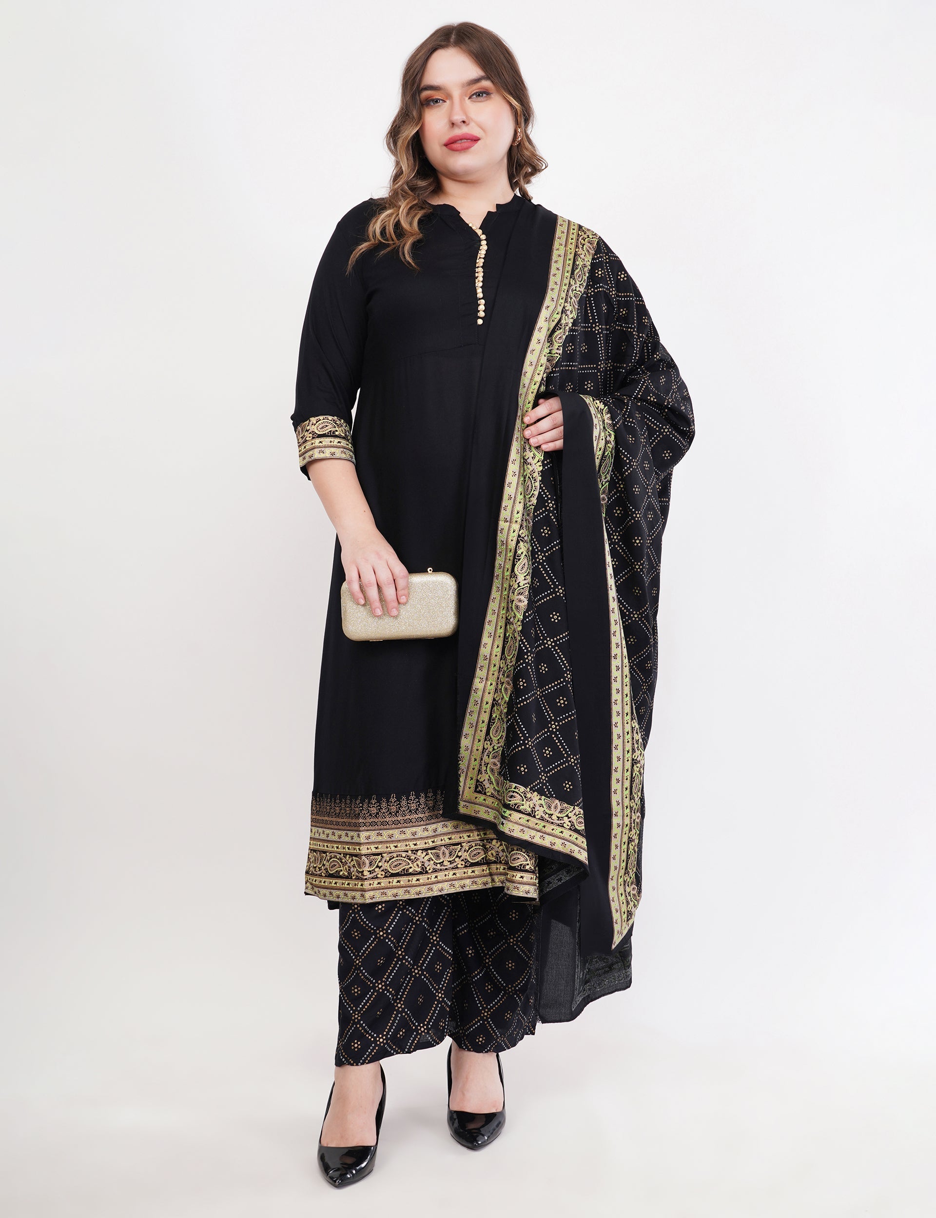 The Black Anarkali set is a striking choice, featuring exquisite block prints and golden contrast detailing that adds a touch of elegance. Paired with matching pants and dupatta, this outfit balances traditional charm with contemporary style. The rich teal hue beautifully enhances the golden accents, making it perfect for festive occasions or celebrations. This ensemble is sure to make a statement while keeping you comfortable and chic! - Anarkali Suit - Set of 3- Kurti, Pants, Dupatta - Fabric: Rayon - Color- Black - Block Printed - Set of 3
