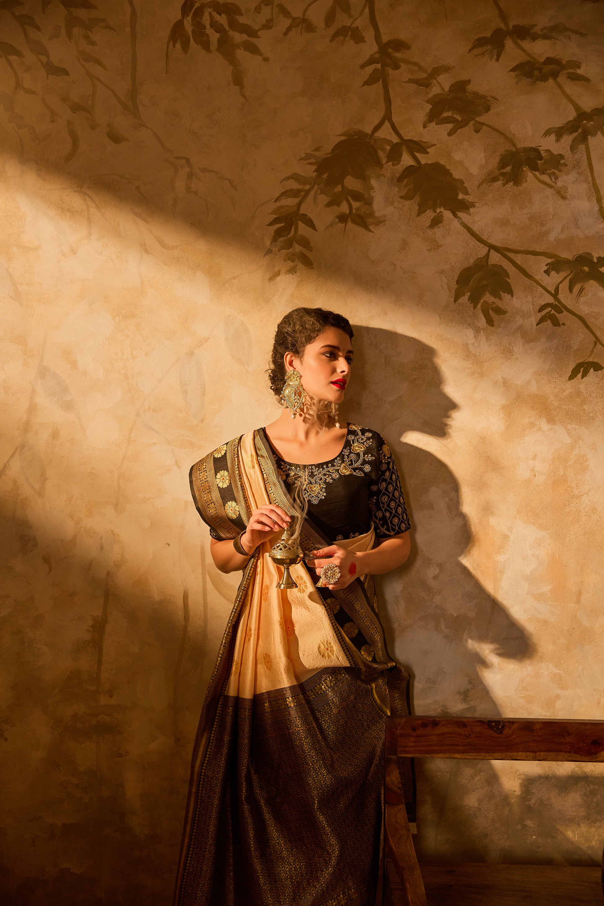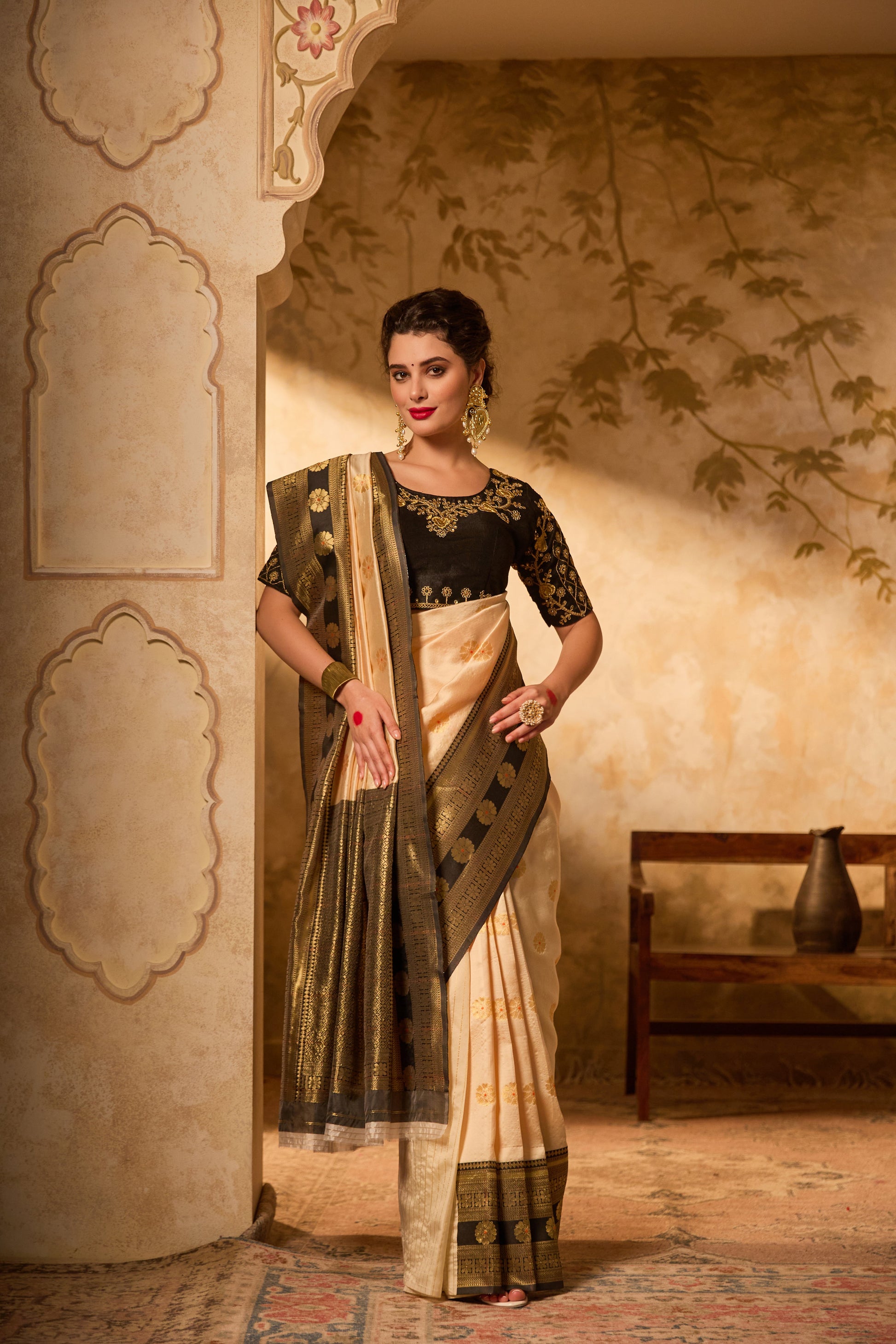 Cream & Black Kanjivaram Silk Saree With Gold Zari Motifs