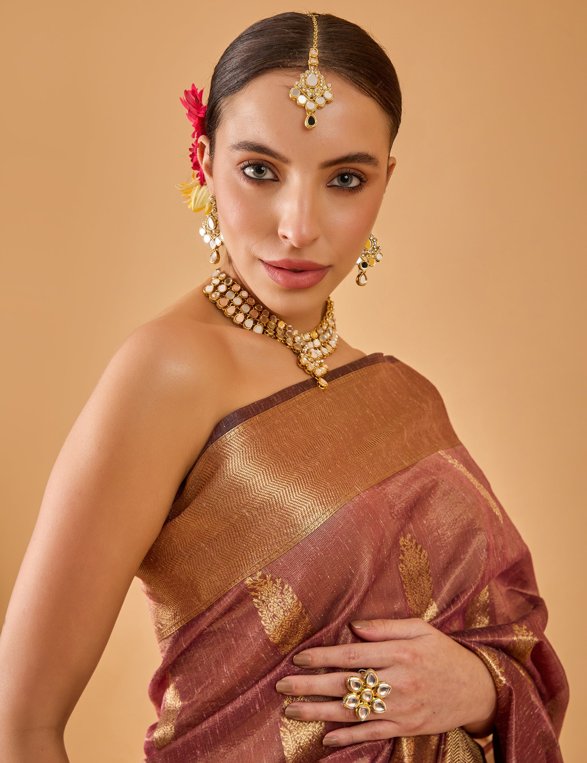 A regal saree in a rich amethyst purple, crafted in airy Chanderi with intricate jacquard weaving that lends a subtle sheen and texture. The solid body allows the craftsmanship to shine, making it a timeless choice for festive and formal occasions. This saree comes with a matching unstitched blouse piece, offering versatility and ease of customization to reflect your style.