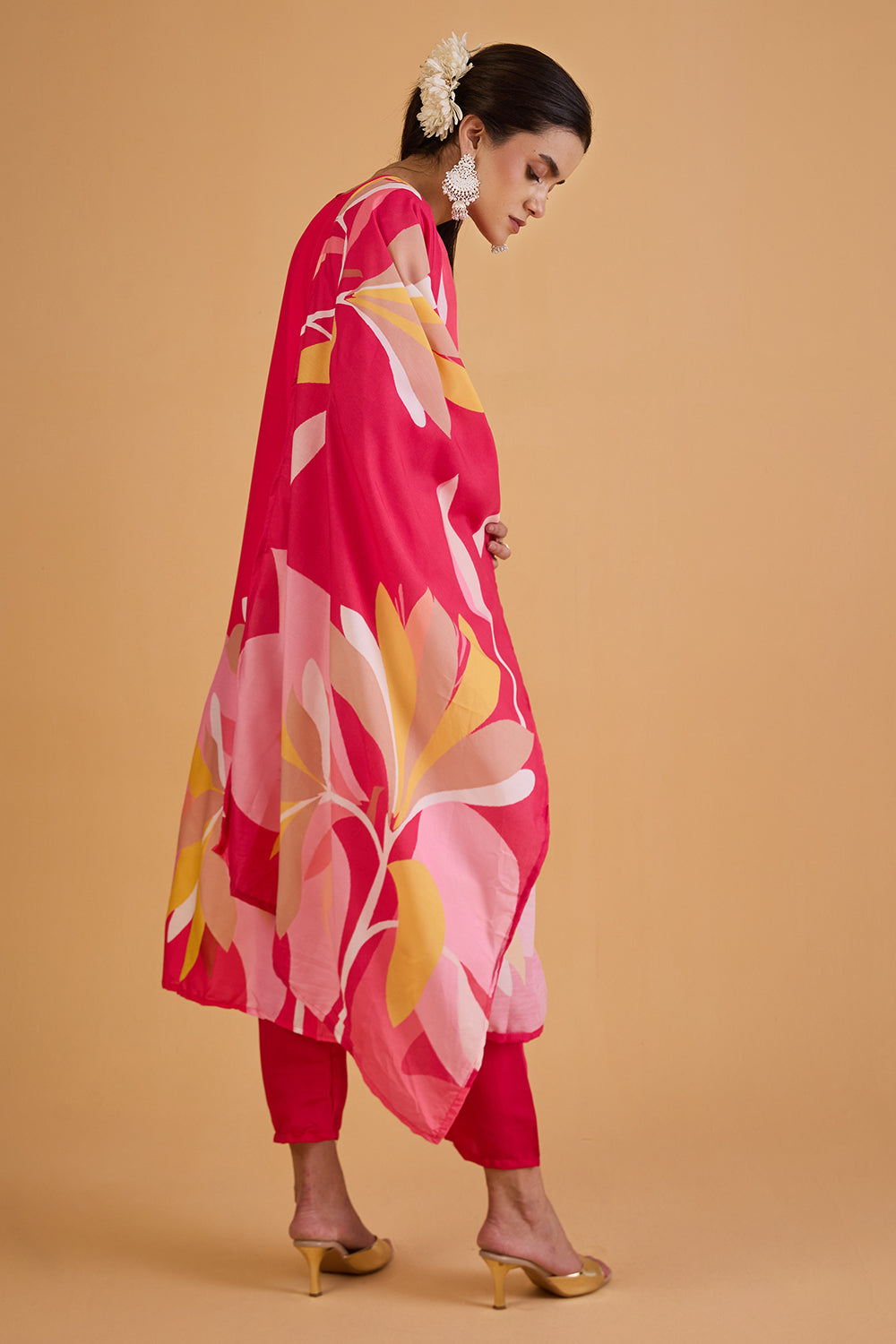 A vibrant suit set in soft pink hues, featuring an abstract print that brings modern artistry to traditional wear. Crafted from a comfortable viscose blend. This set offers breathable elegance with a fluid silhouette perfect for day-to-night occasions. Includes an unstitched dupatta and bottom piece, allowing you to customize your ensemble for a personalized, effortless look.