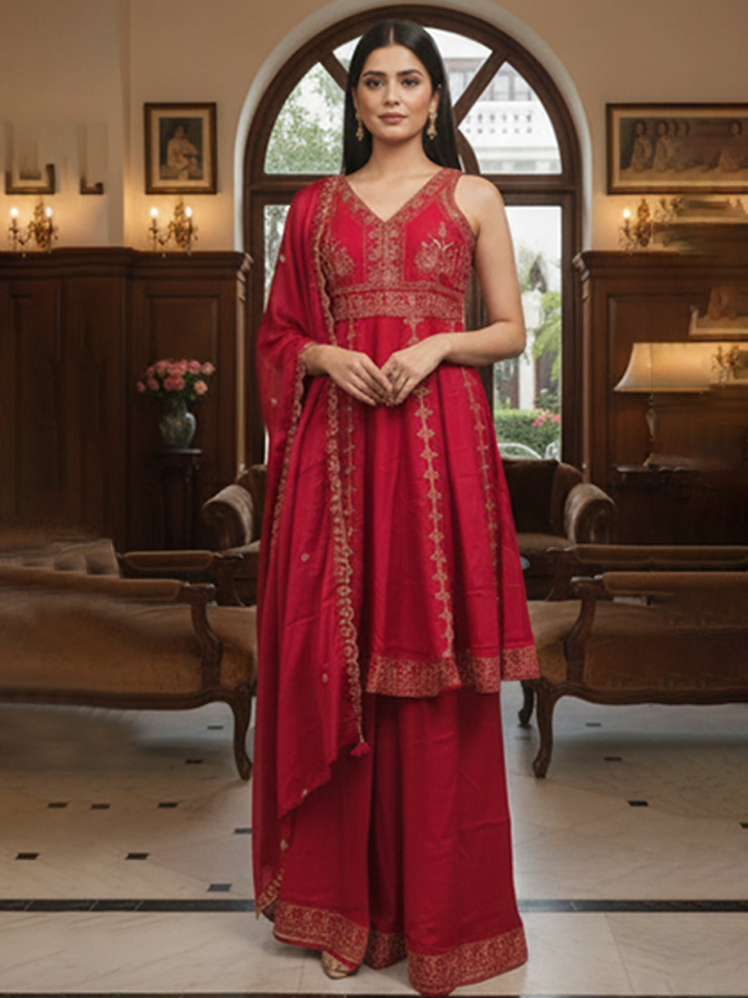 Elegant Red Muslin Anarkali Set with Flared Pant for Women