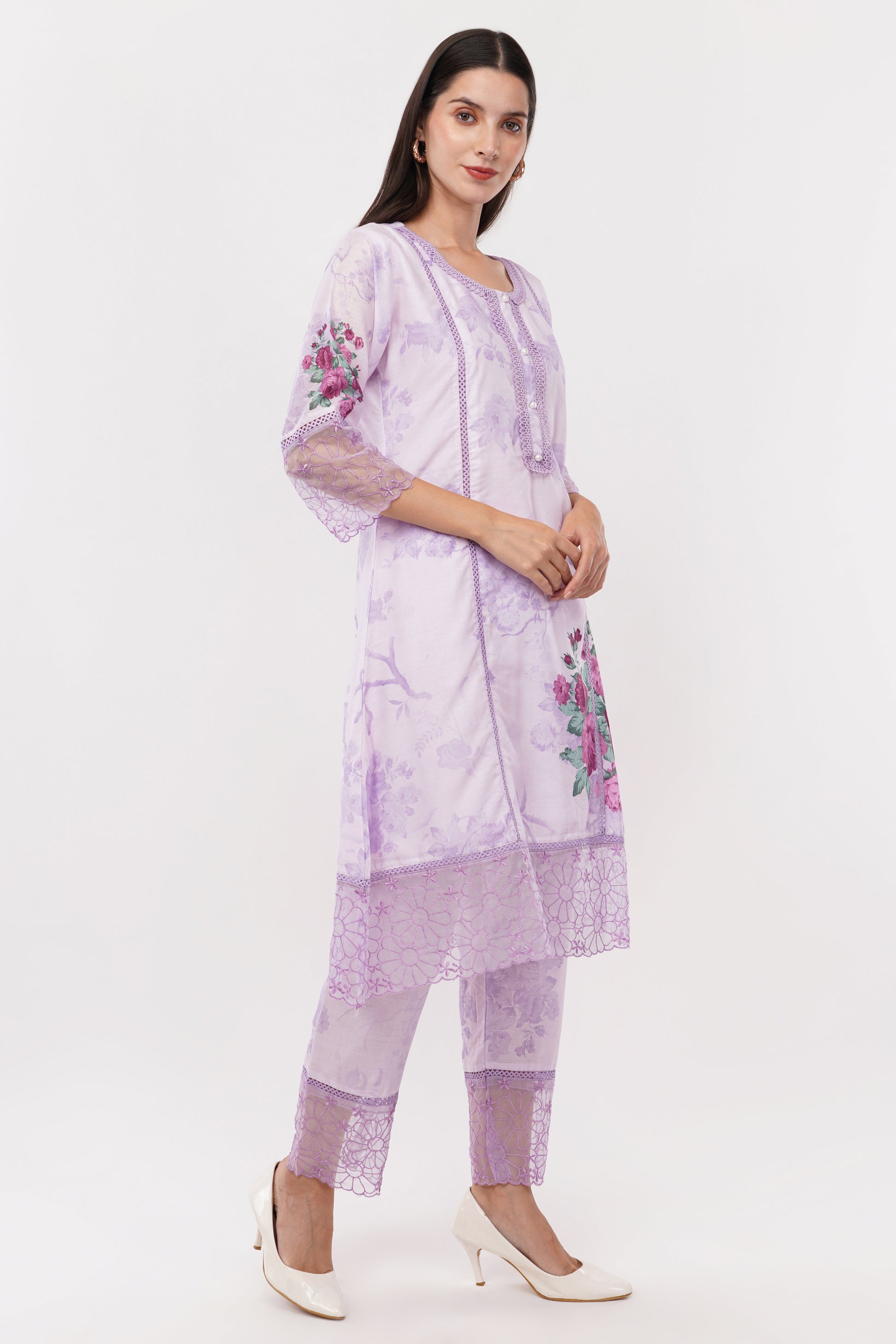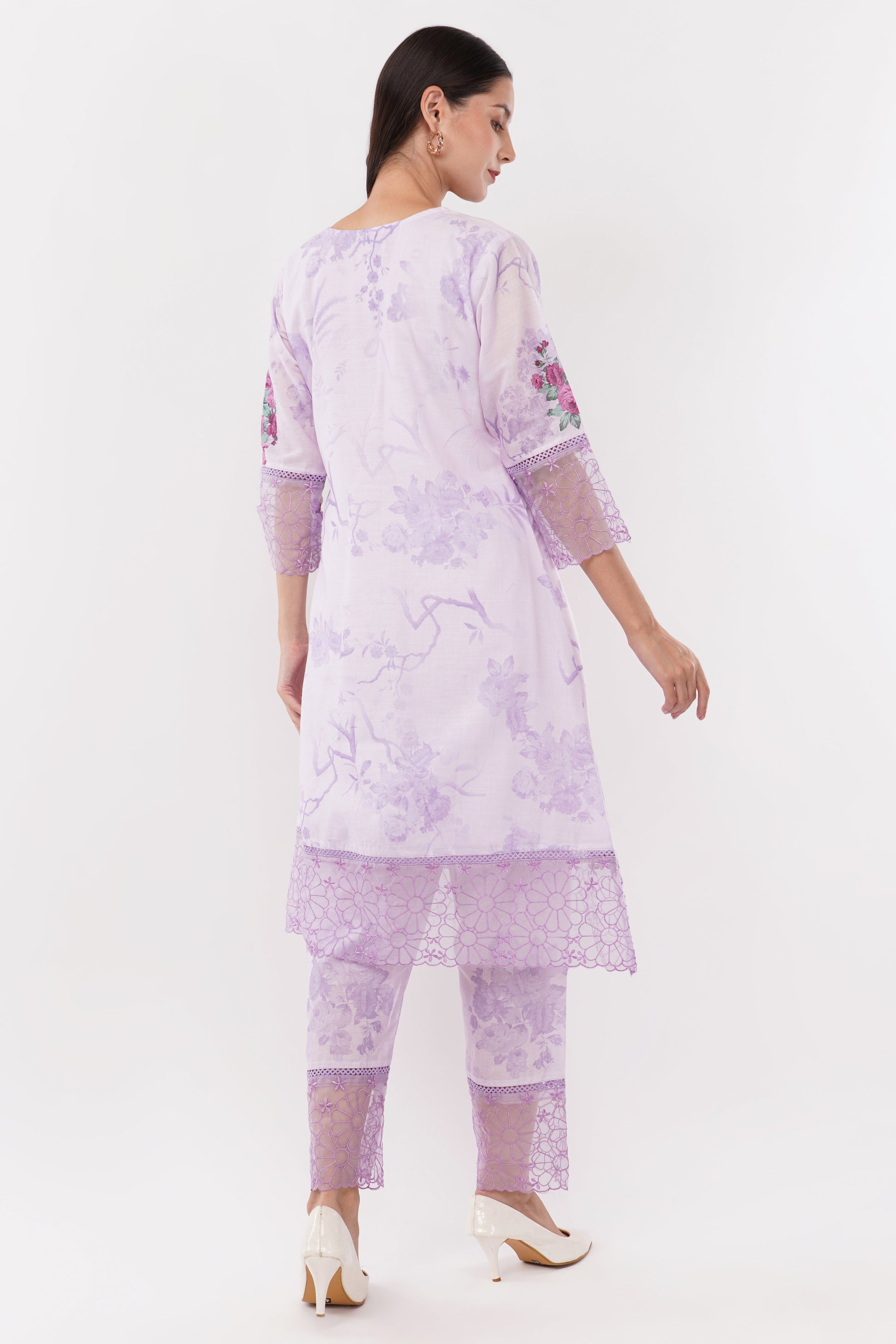Lavender Short Printed Suit Set & Dupatta, With Sheer Details - Set Of 3
