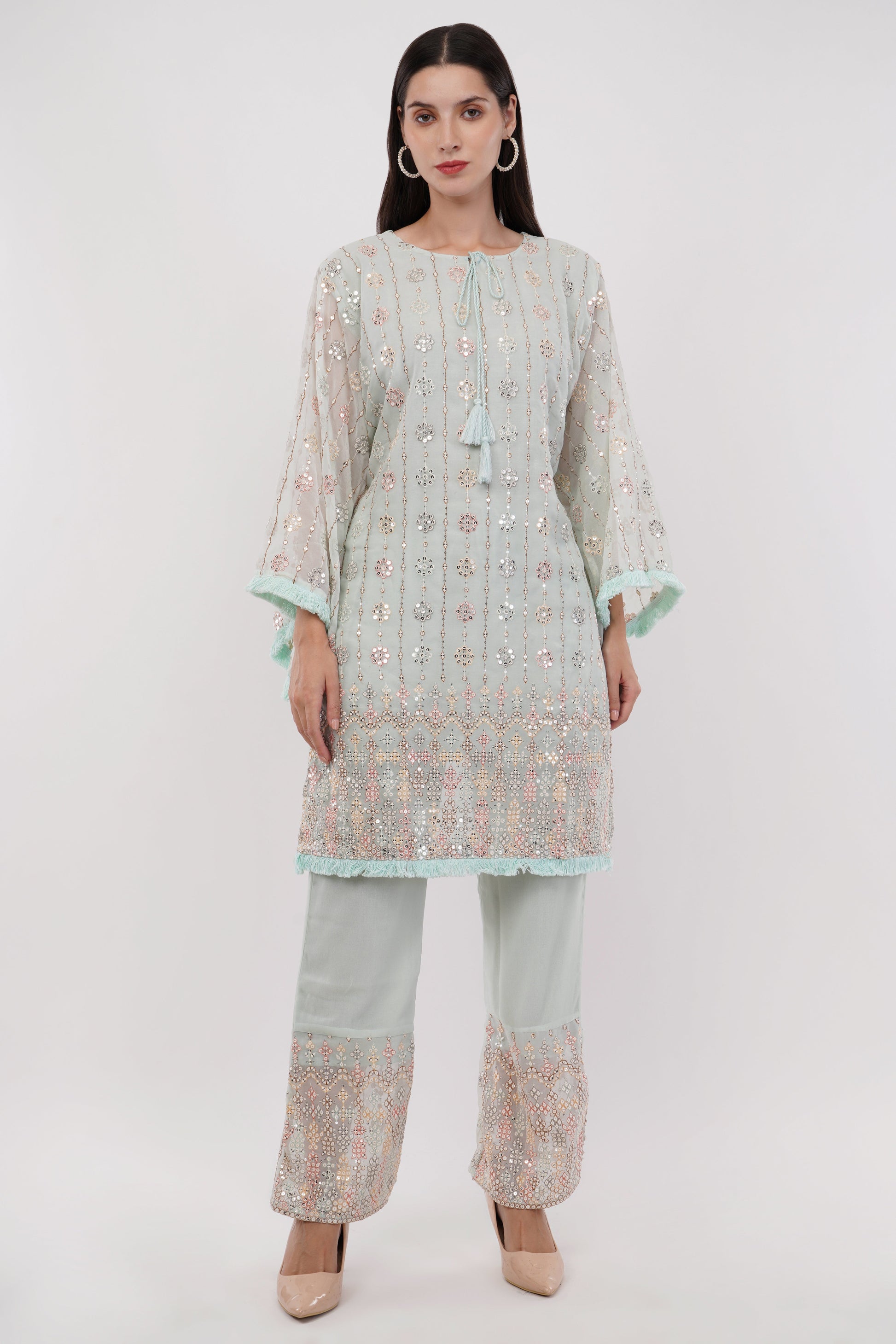 This light blue pastel co-ord set with wide flared sleeve in georgette is both delicate and stylish, featuring intricate embroidery that adds a touch of elegance to its soft, flowing fabric. The lightweight georgette drapes beautifully, creating an airy, feminine silhouette perfect for daytime events or festive gatherings. Its pastel hue and refined detailing offer a fresh, modern look with timeless charm. - Co-ord Set - Embroidered - Fabric- Georgette - Color- Light Blue - Sleeves- Full - Set of 2