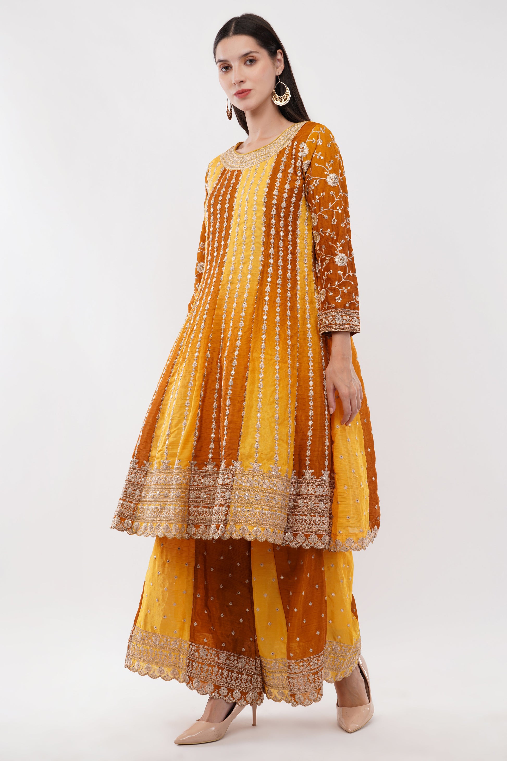 Mustard Chinon Fabric Embroidered Suit With Flared Pants & Dupatta - Set Of 3