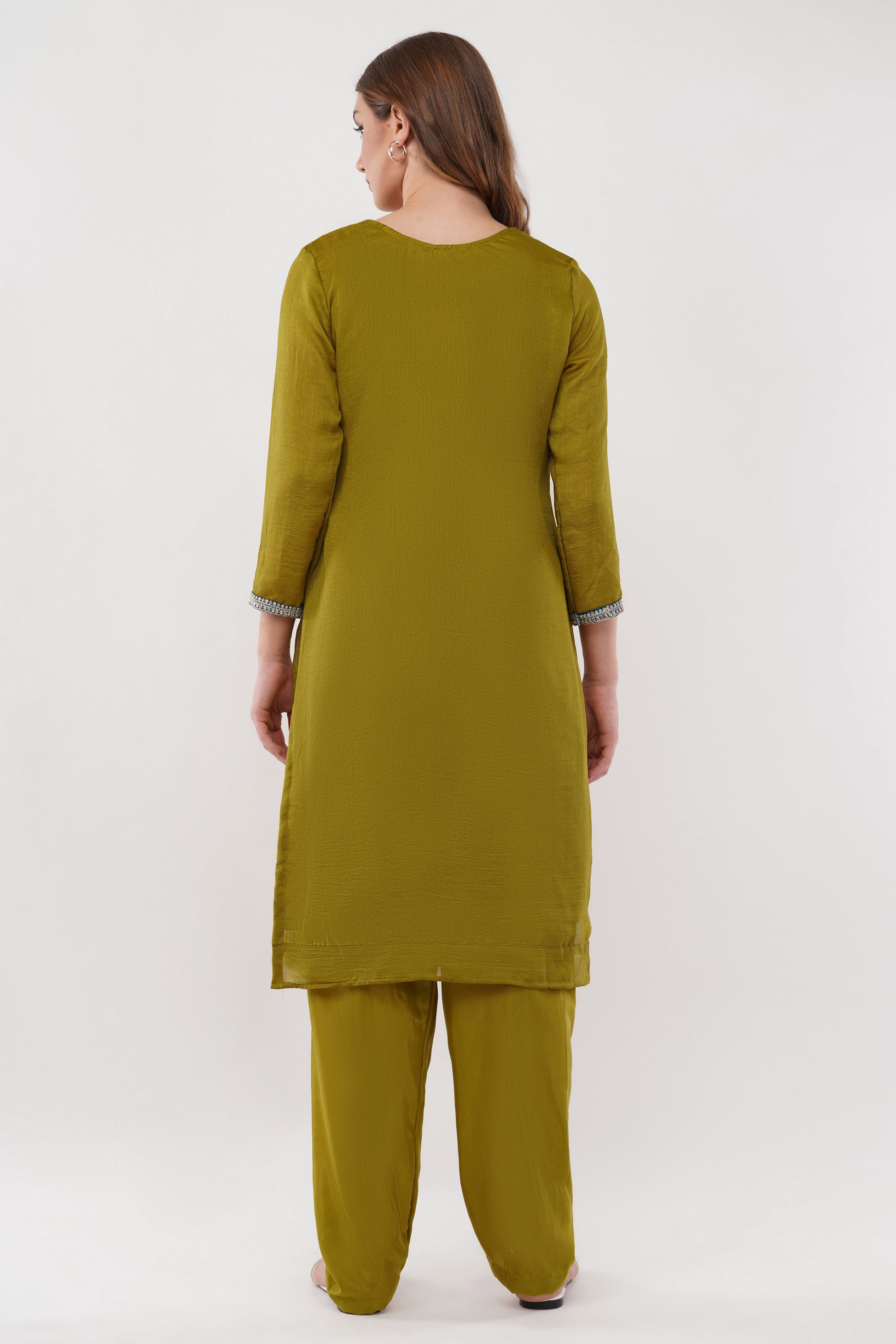 This Mustard Vichitra Silk Suit with multi-color dupatta, is a stunning blend of traditional craftsmanship and elegance. Adorned with multi-thread and zari work, it features intricate sequin and codding embroidery stitch details that add depth and sophistication. The luxurious Vichitra silk fabric enhances its vibrant hue, making it ideal for festive occasions. This ensemble radiates grace with its detailed embellishments and refined silhouette. - Suit Set - Multi Thread & Zari with Sequence & Codding Embroidery Stitch Work - Fabric- Vichitra Silk - Color- Mustard, Dupatta: Multi-Color - Sleeves- 3/4th - Set of 3