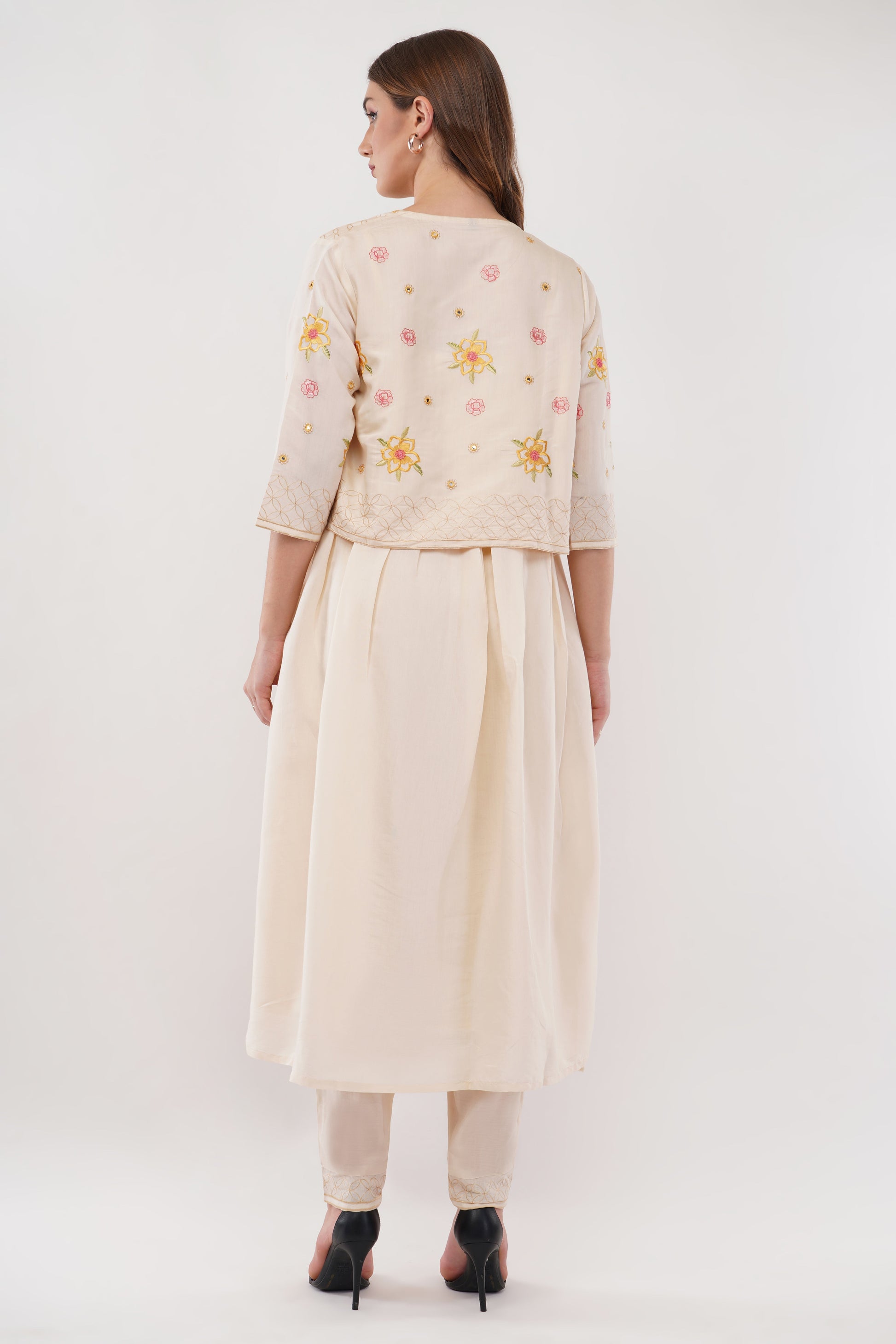 Off White Viscose Silk Anarkali Set With Jacket - Set Of 3
