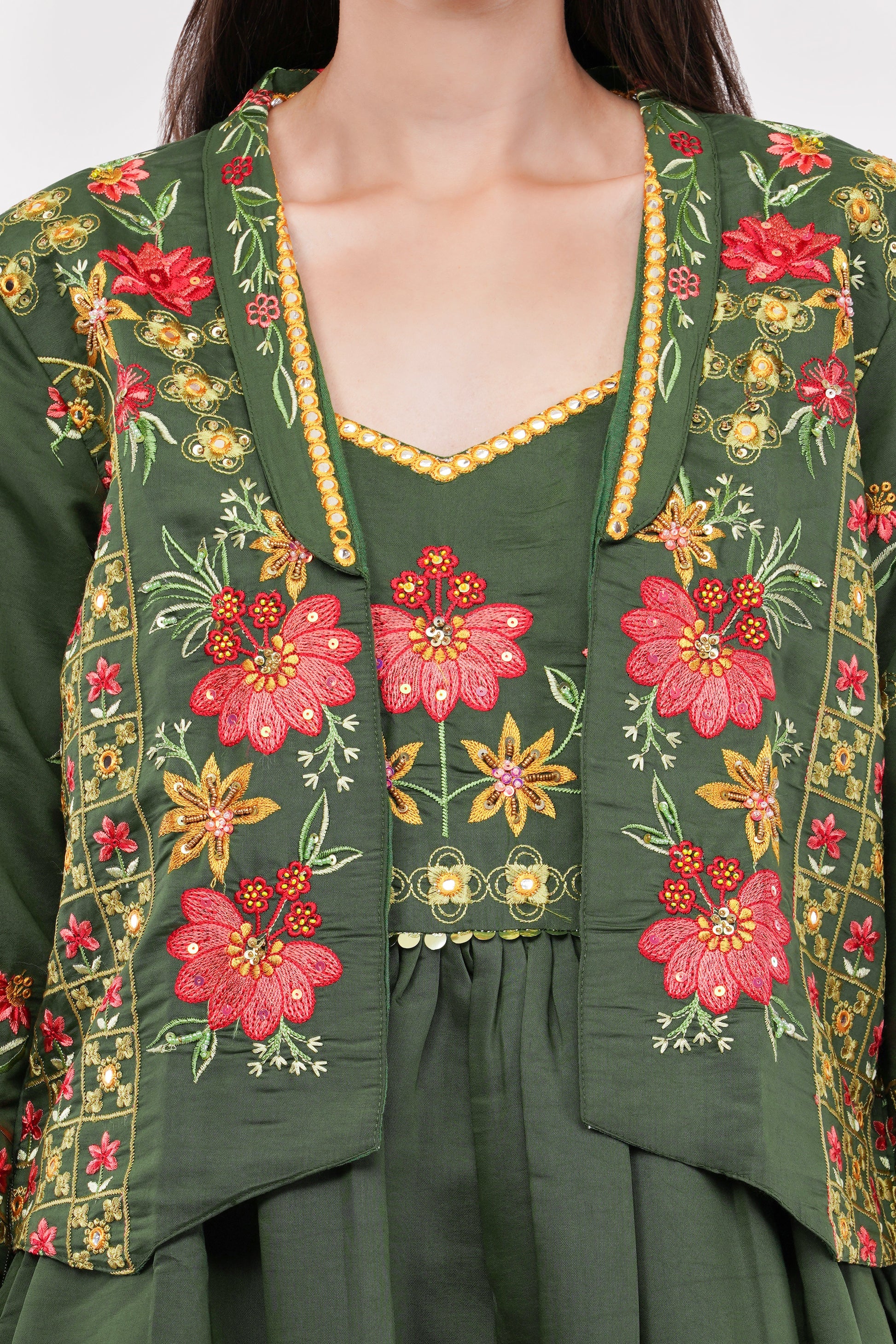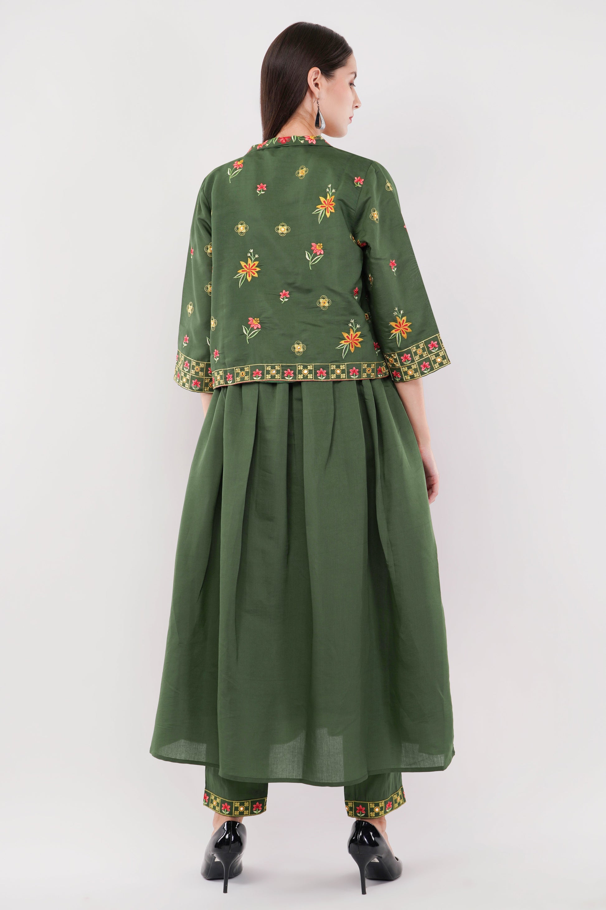 Olive Green Viscose Silk Anarkali Set With Jacket Anarkali - Set Of 3