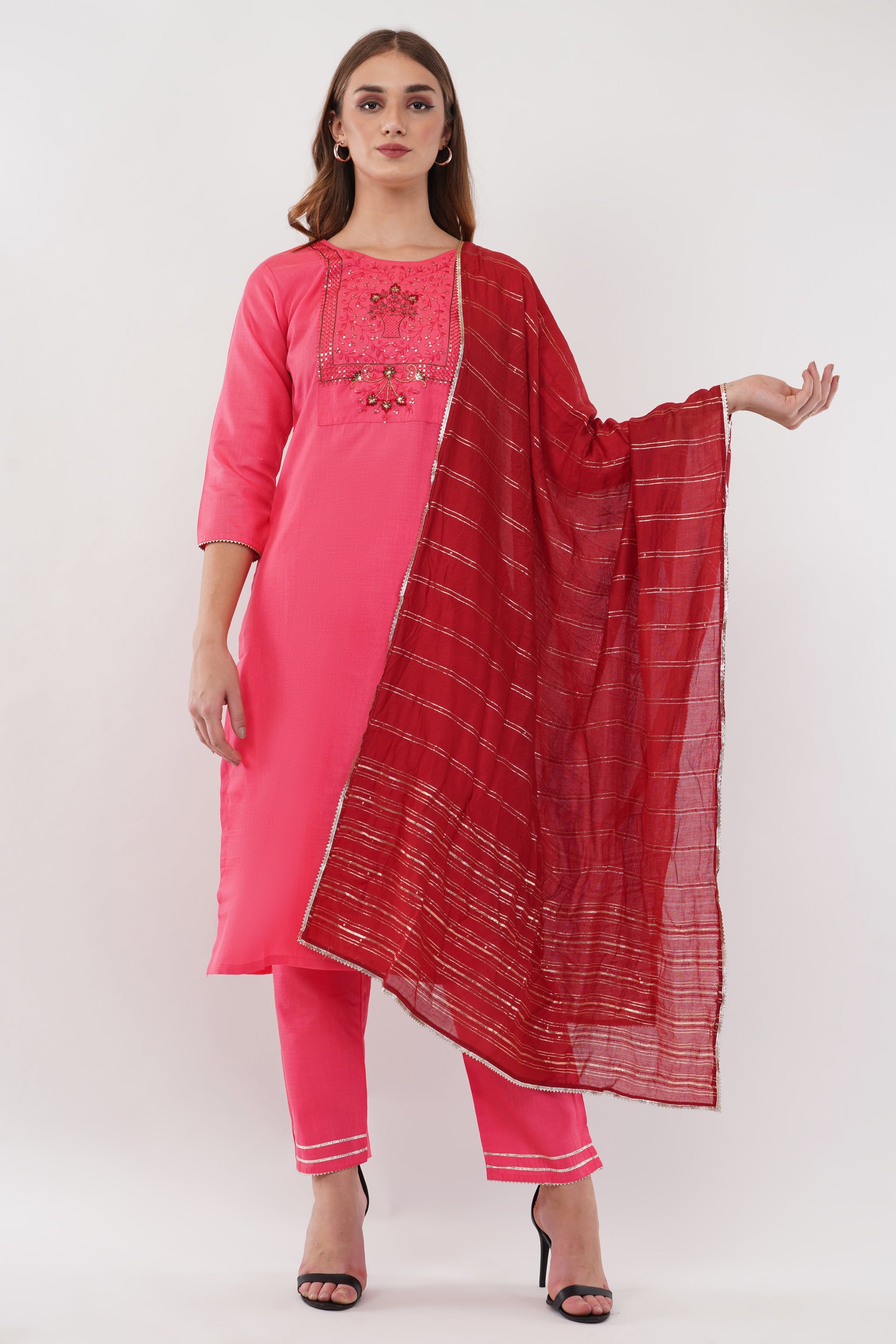 The Pink Suit Set with Embroidered Yoke, paired with Dupatta is crafted from breathable cotton, offering both style and comfort. The intricately embroidered yoke adds an elegant touch, enhancing the hue with subtle detailing. Perfect for both casual outings and festive gatherings, this suit set effortlessly combines sophistication with ease. - Suit Set & Dupatta - Fabric: Cotton - Color- Pink - Sleeves- 3/4th - Set of 3