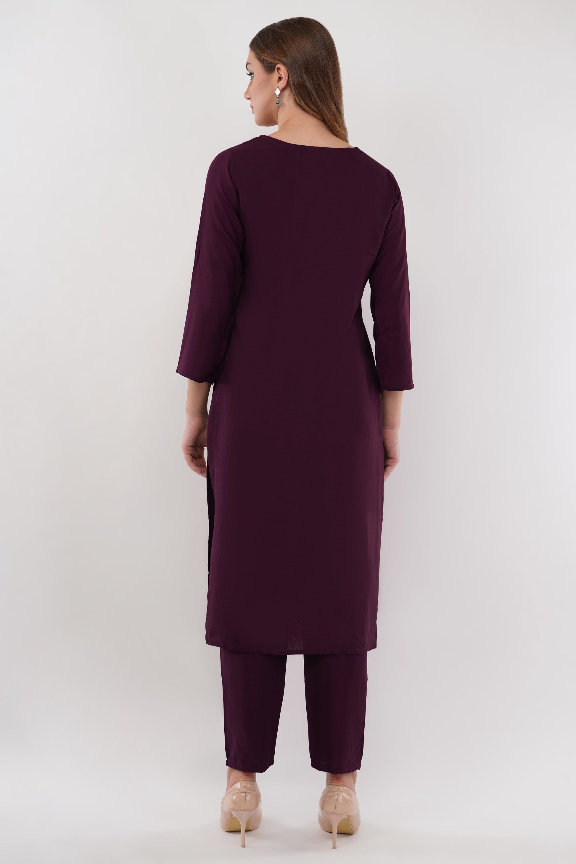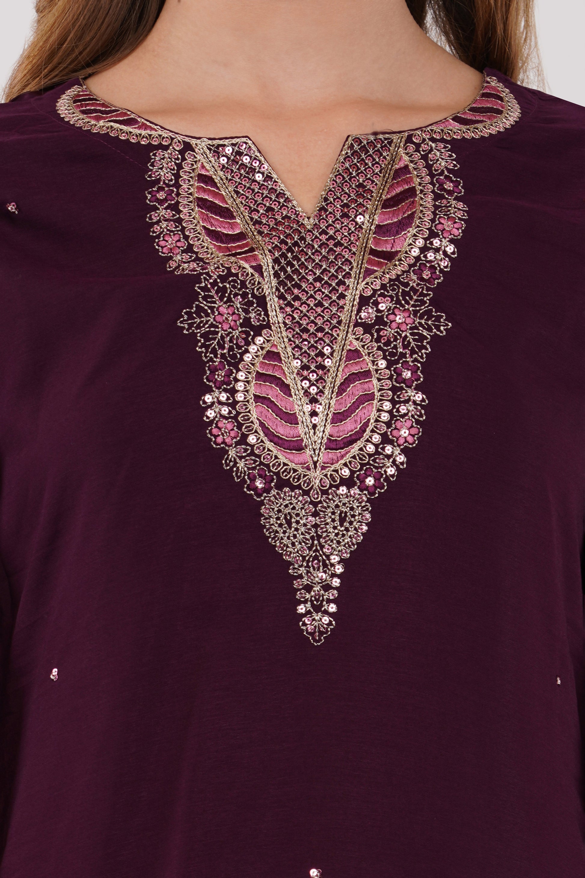 This Purple Viscose suit set combines elegance with comfort, featuring a smooth drape and a refined silhouette. The printed dupatta adds a striking visual contrast, elevating the overall look with subtle flair. Ideal for both casual gatherings and festive events, the rich purple hue and lightweight fabric create a chic and versatile outfit that’s both stylish and easy to wear. - Suit Set with Printed Dupatta - Embellished Yoke - Fabric- Viscose - Color- Purple - Sleeves- 3/4th - Set of 3