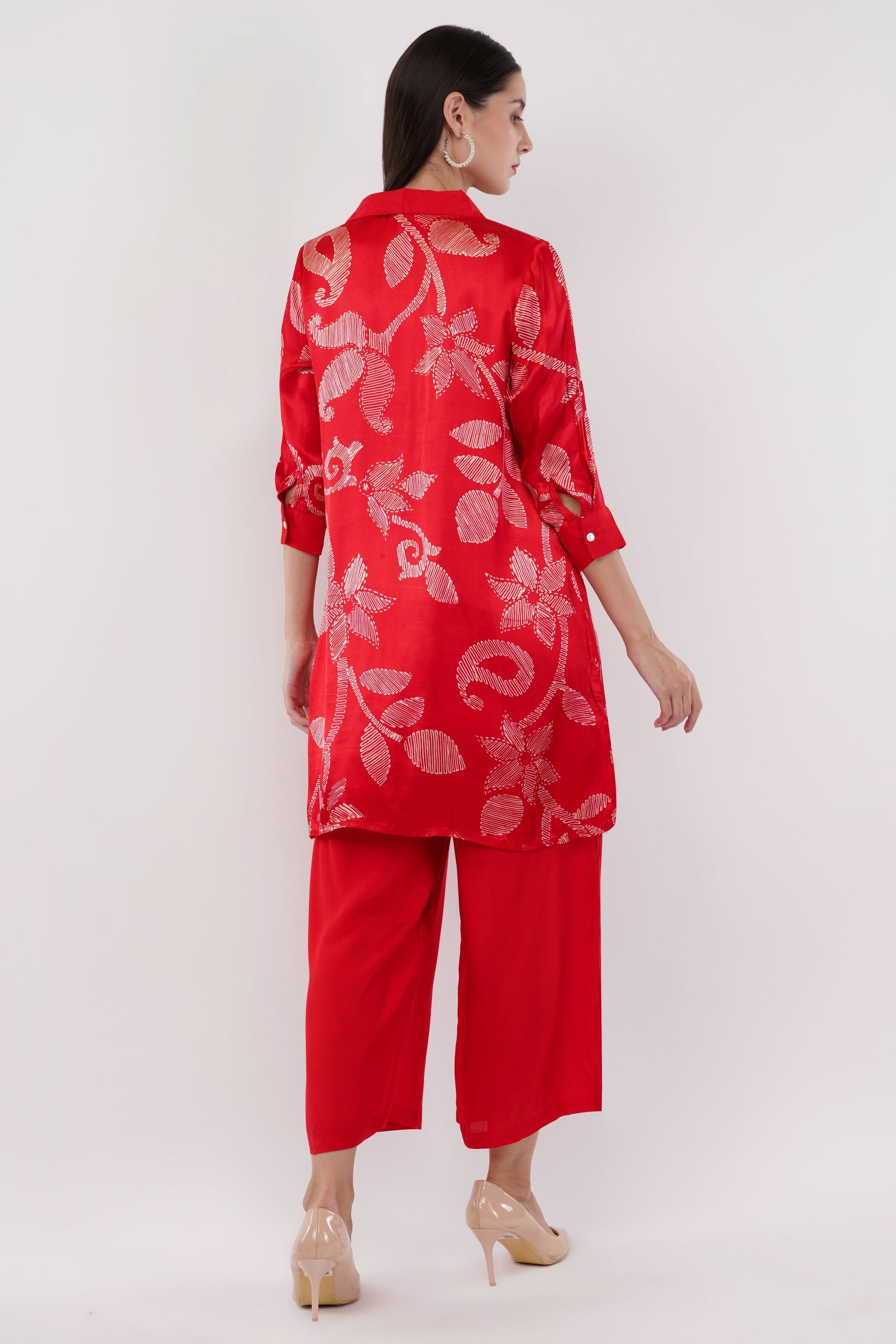 Red Gaji Silk Printed Shirt Co-Ord Set - Set Of 2