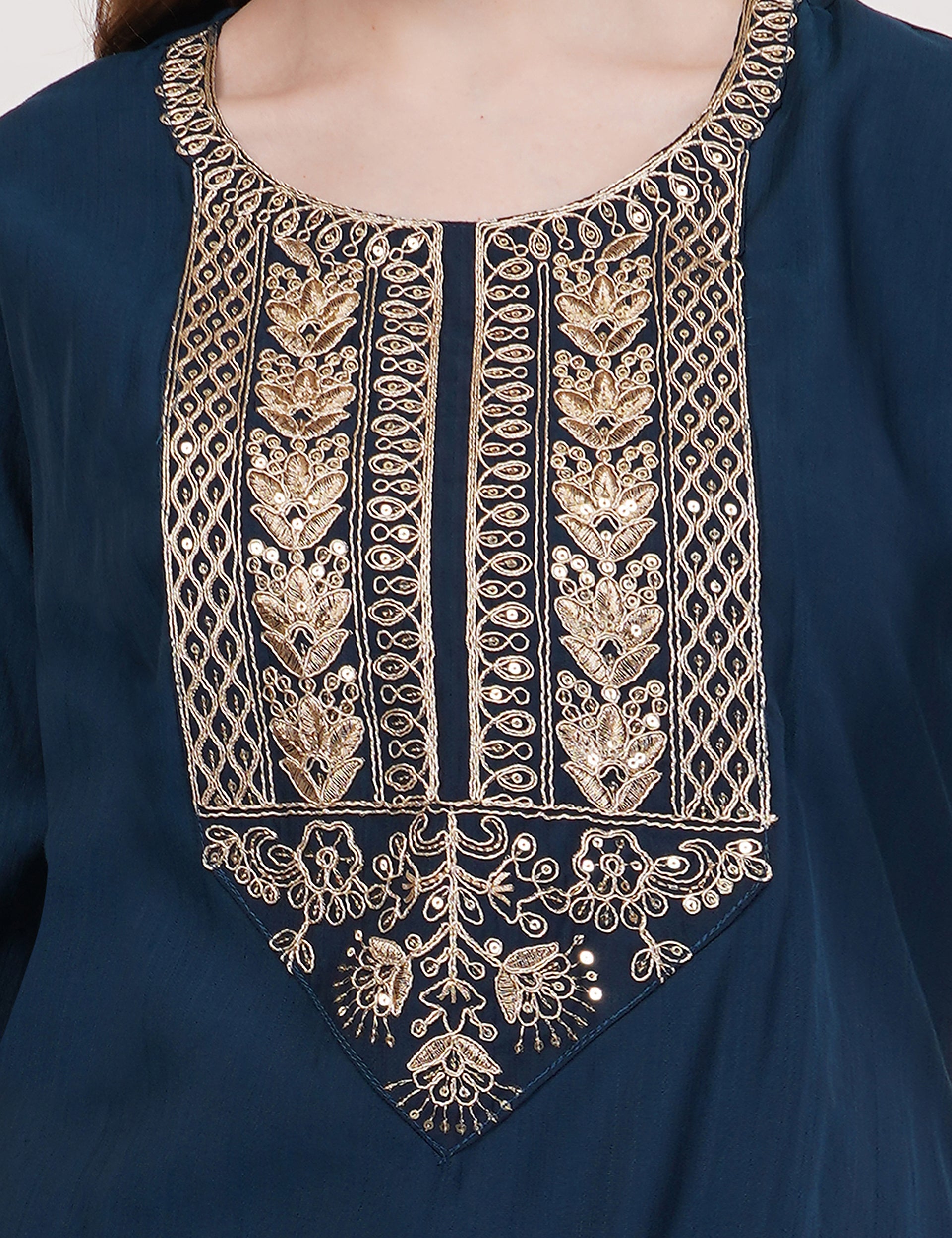 This Teal Blue Straight Suit in Silk exudes understated elegance, featuring an embellished yoke and detailed hemlines for a refined touch. Paired with a coordinating dupatta, this ensemble combines softness with sophistication, perfect for festive gatherings or formal occasions. The silk fabric and delicate embellishments bring a graceful appeal to this timeless outfit. - Straight Suit - Embellished Yoke & Hemlines - Fabric- Silk - Color- Teal Blue - Sleeve- 3/4th - Set of 3