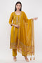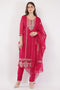 The Teal Green Embroidered Suit Set is a vibrant and stylish outfit crafted from soft crape fabric. The intricately embroidered top is paired with matching crape bottoms, while the lightweight organza dupatta adds an elegant touch. This ensemble is perfect for festive occasions, combining bright color with refined detailing. - Embroidered Suit Set & Dupatta - Fabric: Top & Bottom: Crape, Dupatta: Organza - Color- Teal Green - Sleeves- 3/4th - Set of 3