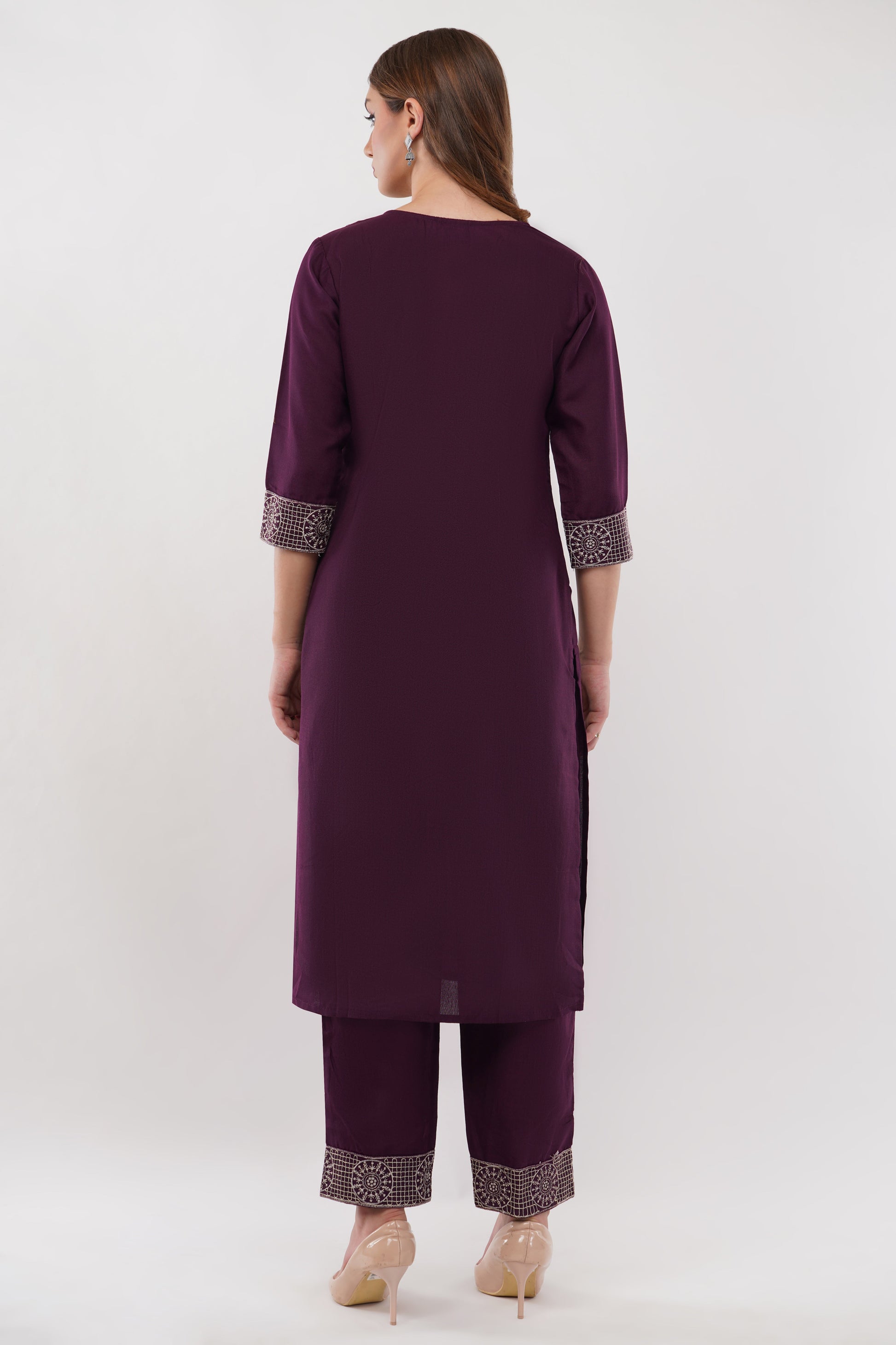 Make a statement in this elegant wine-colored embroidered straight suit. The hue and intricate detailing highlight its stylish design, while the sleek pants ensure a flattering silhouette. Paired with a beautiful dupatta, this ensemble is perfect for any festive occasion. Elevate your style with this stunning piece! - Straight Suit - Set of 3- Kurti, Pants, Dupatta - Fabric: Cotton Blend - Color: Wine - Embroidered - Round Neckline - Set of 3